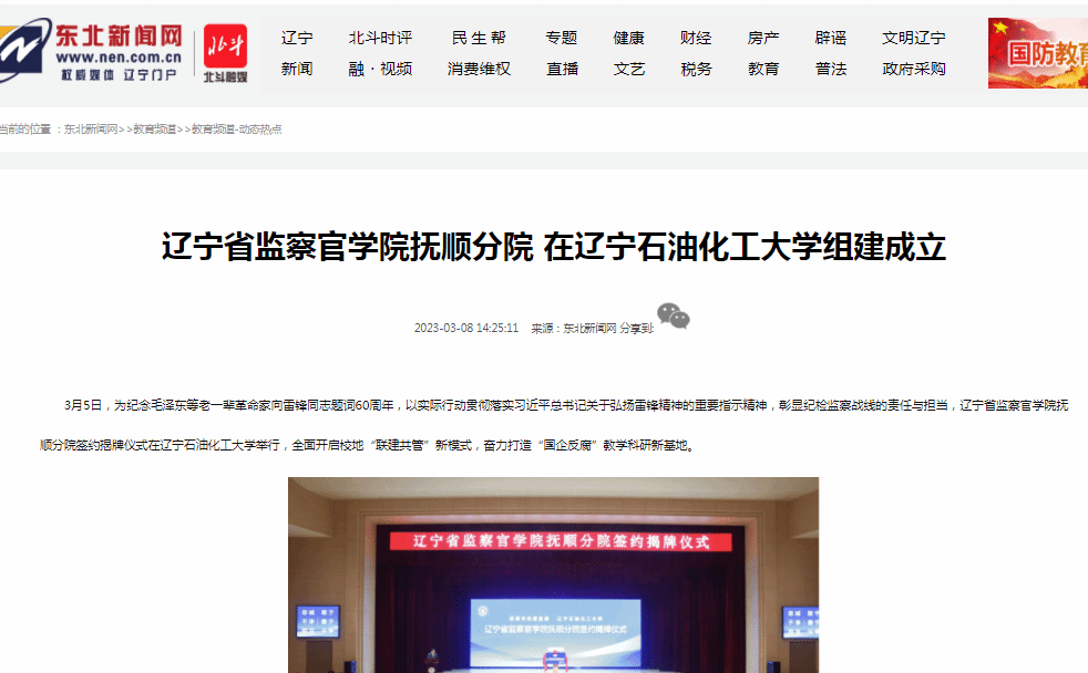 编者按:近日,东北新闻网对辽宁省监察官学院抚顺分院签约揭牌仪式在我校举行,全面开启校地“联建共管”新模式,奋力打造“国企反腐”教学科研新基地进行了宣传报道。现将相关报道转载如下: