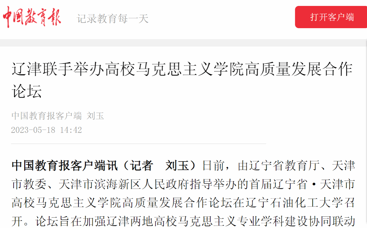 编者按:近日,中国教育报客户端、人民网等媒体平台对我校为加强辽津两地高校马克思主义专业学科建设协同联动发展,促进双方教学科研工作协作深度融合,进一步巩固马克思主义理论教育教学阵地,建强马克思主义理论人才培养基地,召开首届辽宁省·天津市高校马克思主义学院高质量发展合作论坛进行了宣传报道。现将相关报道转载如下: