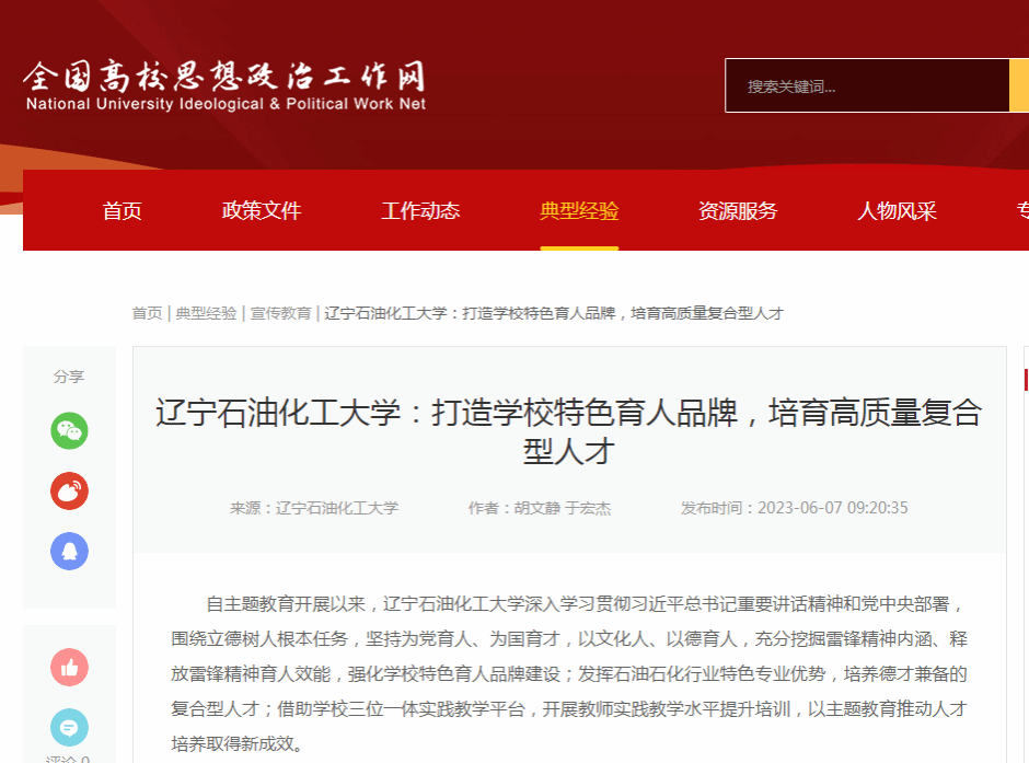 编者按:近日,全国高校思想政治工作网、辽宁日报·北国号等媒体平台对我校围绕立德树人根本任务,坚持为党育人、为国育才,以文化人、以德育人,充分挖掘雷锋精神内涵、释放雷锋精神育人效能,强化学校特色育人品牌建设;发挥石油石化行业特色专业优势,培养德才兼备的复合型人才;借助学校三位一体实践教学平台,开展教师实践教学水平提升培训,以主题教育推动人才培养取得新成效进行了宣传报道。现将相关报道转载如下: