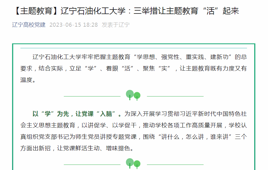 编者按:近日,辽宁高校党建微信公众号对我校牢牢把握主题教育“学思想、强党性、重实践、建新功”的总要求,结合实际,立足“学”、着眼“活”、聚焦“实”,让主题教育既有力度又有温度作了报道,文章由宁璇、李一鸣撰写。现将相关报道转载如下: