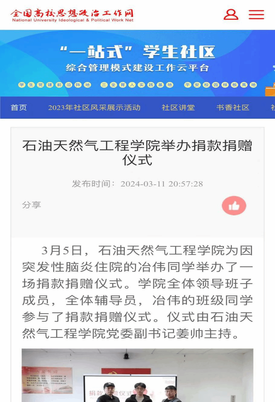 编者按:“病魔无情,人间有爱!”3月5日,石油天然气工程学院为因突发性脑炎住院的冶伟同学举办了一场捐款捐赠仪式。全国高校思想政治工作网对此进行了报道。现将相关报道转载如下: