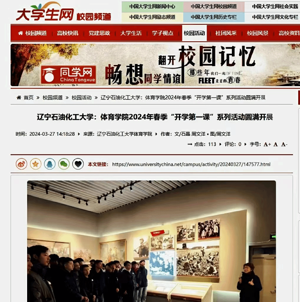 编者按:为落实立德树人根本任务,以不负时代、勇毅前行的奋进姿态开启2024年春季学期新征程,体育学院开展“开学第一课”系列主题活动,中国大学生网进行了宣传报道。现将相关报道转载如下: