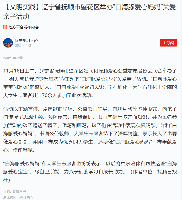 学习强国、抚顺日报、今日望花微信公众号:区妇联与抚顺爱心公益志愿者协会联合举办“白海豚爱心妈妈”关爱亲子活动