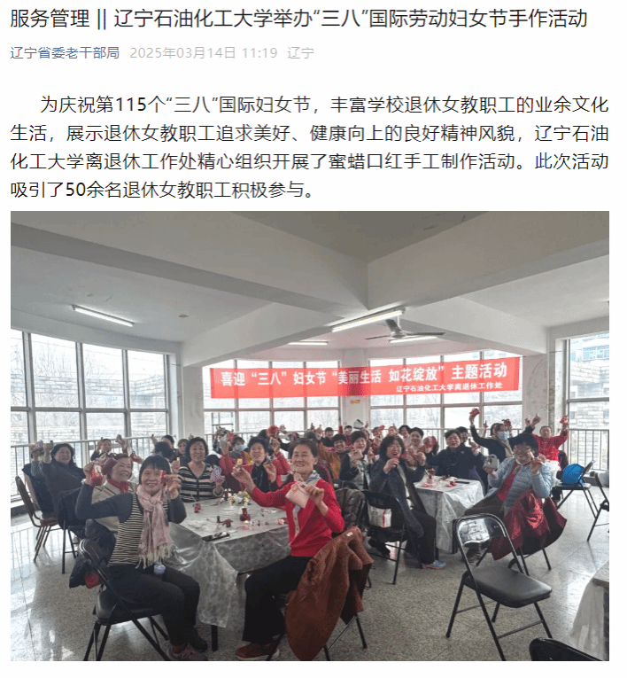 编者按:近日,辽宁省委老干部局微信公众号登载了我校离退休工作处撰写的文章《国产亚洲综合一区二区三区_亚洲欧美日韩中文天堂_尤物在线观看视频不卡无码_国产最新精品亚洲2025不卡_亚洲成Av人在线观看片水蜜桃举办“三八”国际劳动妇女节手作活动》。现将相关报道转载如下: