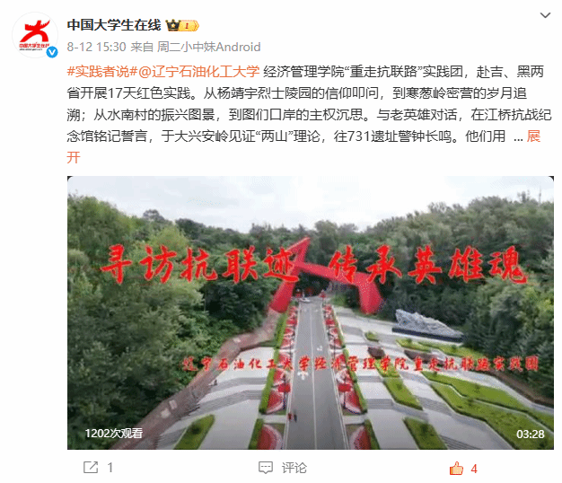 教育部中国大学生在线官方微博:经济管理学院“重走抗联路”实践团,赴吉、黑两省开展17天红色实践